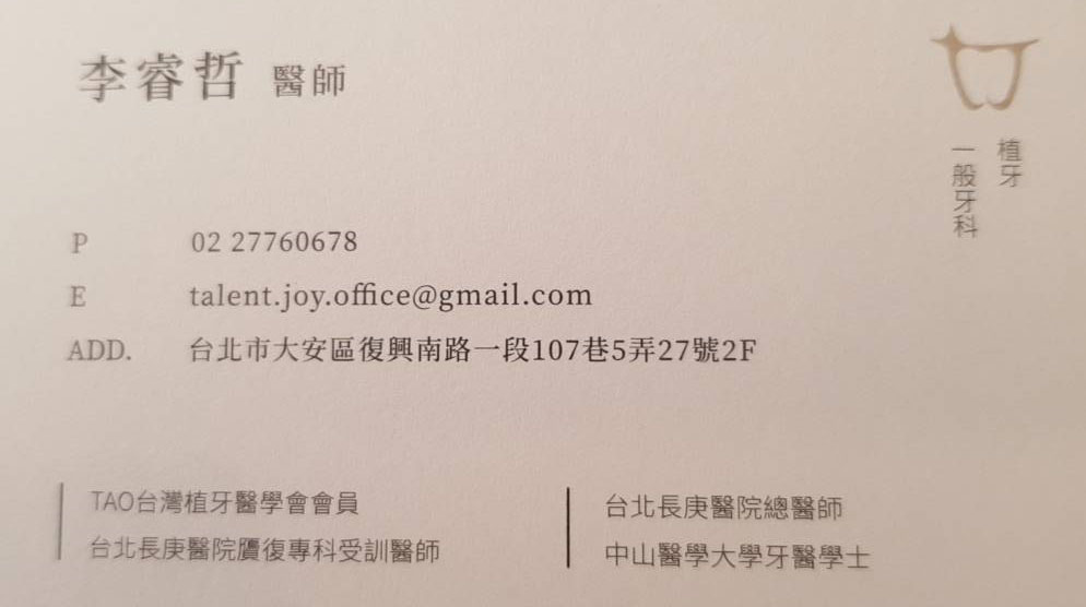 台北市大安區復興南路一段107巷5弄27號2F得愉牙醫李睿哲醫師02 27760678